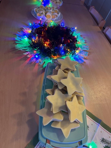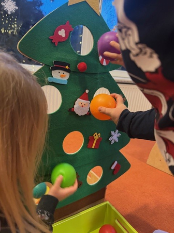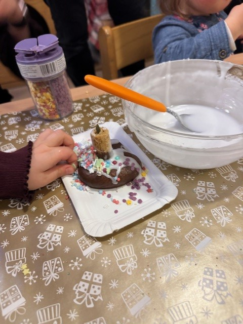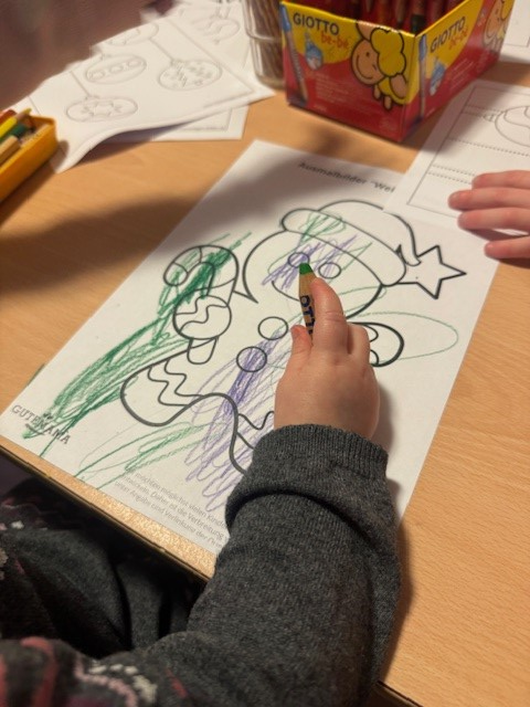 Im Anschluss konnten die Kinder kreativ werden. Es wurden essbare Kerzen gestaltet, Weihnachtsschmuck und Weihnachtskarten gebastelt sowie weitere kreative Angebote. Auch im Krippenbereich stand das kreative Tun im Vordergrund: Malangebote, essbare Kerzen gestalten und verschiedene motorische und feinmotorische Spiele luden zum Entdecken und Mitmachen ein.