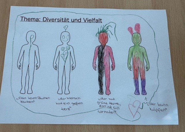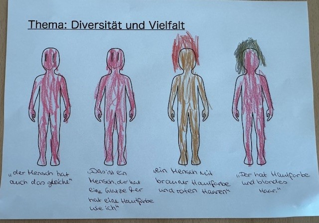 Auch das Thema Vielfalt wurde aufgegriffen. Gemeinsam stellten wir fest, wie unterschiedlich wir in unserer Kita sind, sei es in Aussehen, Sprache, Interessen oder Persönlichkeit. Die Kinder erkannten, dass jeder Mensch einzigartig ist und dass Unterschiede unsere Gemeinschaft bereichern.