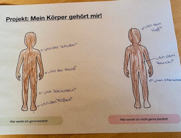 Ein besonders bedeutsames Thema war zudem „Mein Körper gehört mir“. In offenen Gesprächsrunden sprachen wir darüber, dass jeder Mensch selbst bestimmen darf, wer ihn berühren darf und wer nicht. Die Kinder äußerten ihre Meinungen und machten deutlich, dass fremde Menschen sie nicht einfach anfassen dürfen. Dabei wurde auch geübt, deutlich „Nein“ zu sagen und die Grenzen anderer zu respektieren. Ziel war es, die Kinder darin zu stärken, ihre eigenen Körpergrenzen wahrzunehmen, zu benennen und unerwünschte Berührungen klar abzulehnen.