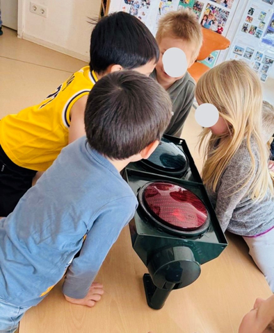 Wir haben gemeinsam mit den Kindern eine Ampel genauer angeschaut und dabei viele spannende Dinge entdeckt. Zunächst haben wir darüber gesprochen, wofür Ampeln im Straßenverkehr wichtig sind, welche Farben es gibt und welche Bedeutung diese haben. Die Kinder konnten ihr Wissen einbringen und wussten bereits, dass Rot „Stopp“, Gelb „Achtung“ und Grün „Gehen“ bedeutet.
